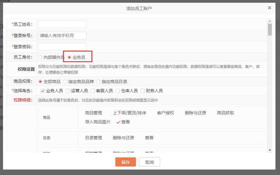 根據(jù)公司業(yè)務(wù)人員負(fù)責(zé)板塊,給業(yè)務(wù)員賬號設(shè)置商品權(quán)限,角色權(quán)限以便其快速啟用在線業(yè)務(wù)工作臺