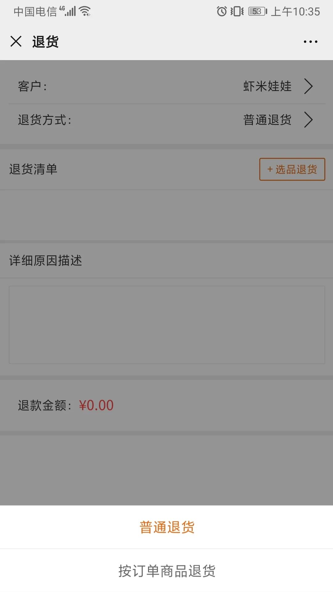 業務員可以在手機端為客戶辦理普通退貨按訂單商品退貨,優化業務員服務體驗。