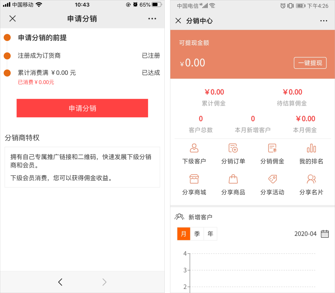 客戶需要申請成為分銷商,才能獲得分銷權限。擁有分銷權限以后,就可實時查看自己的分銷數據。