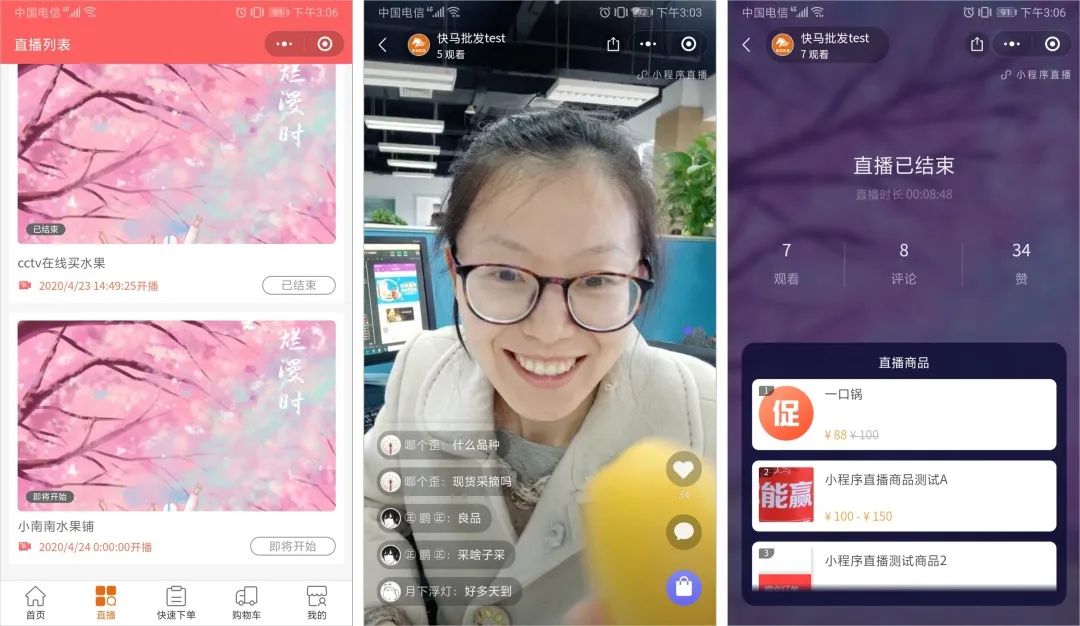 在小程序后臺可以創建直播,然后客戶在小程序端就能看到直播并互動,當主播添加了推薦商品后,可以直接在線購買,實現主播帶貨。