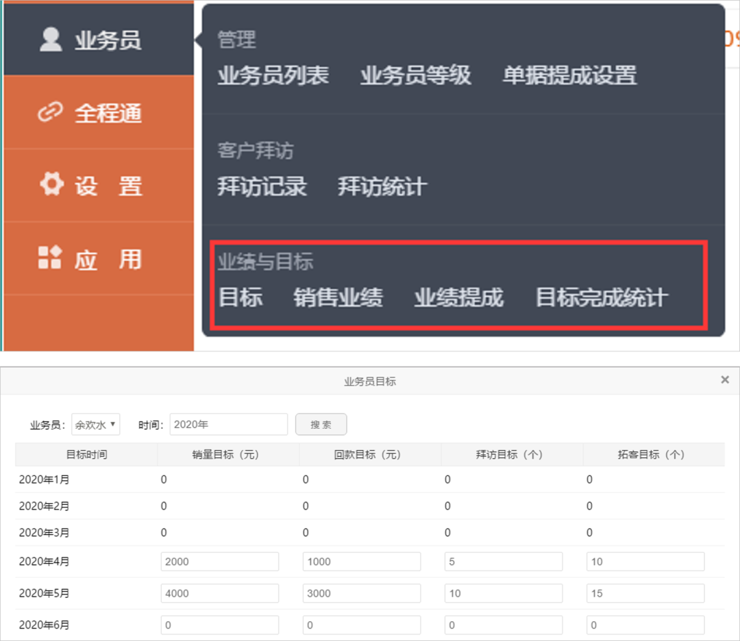 可以在后臺為業務員設置銷售、回款、拜訪、拓客目標,后臺統計表和業務員端自動納入統計,生成對應數據。