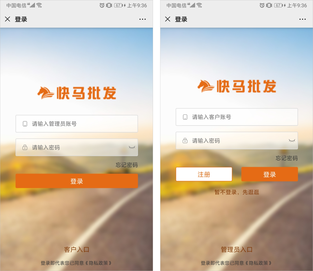 在后臺設置中,添加員工賬號時,為其標記為業務員后,該角色即創建成功。此后,所有端口管li員、業務員登錄端口統一,登錄操作不再做區分。不同身份在登錄界面切換“管li員/客戶”入口即可。并且此后不再有快馬pi發APP,快馬業務員APP,統一為一個快馬APP