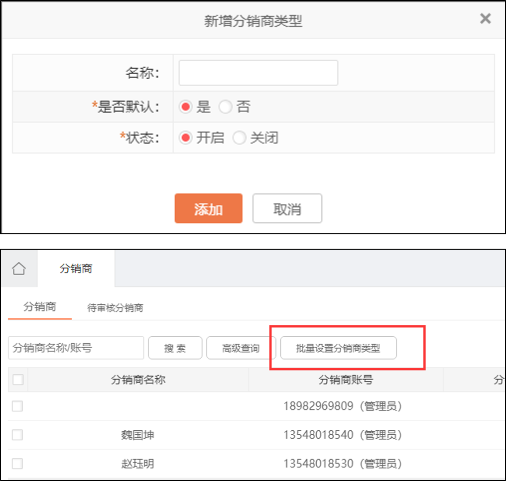 可為分銷商設(shè)置不同類型,并指定該類型的分銷規(guī)則,并支持批量設(shè)置分銷商類型