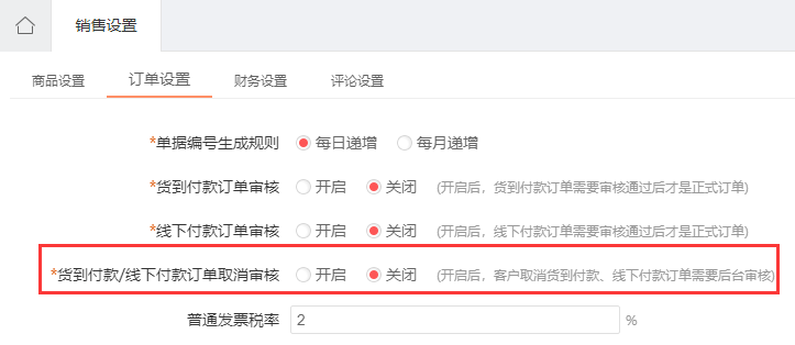 針對貨到付款訂單、線下付款訂單,客戶取消時(shí),可設(shè)置是否需要管li員審核
