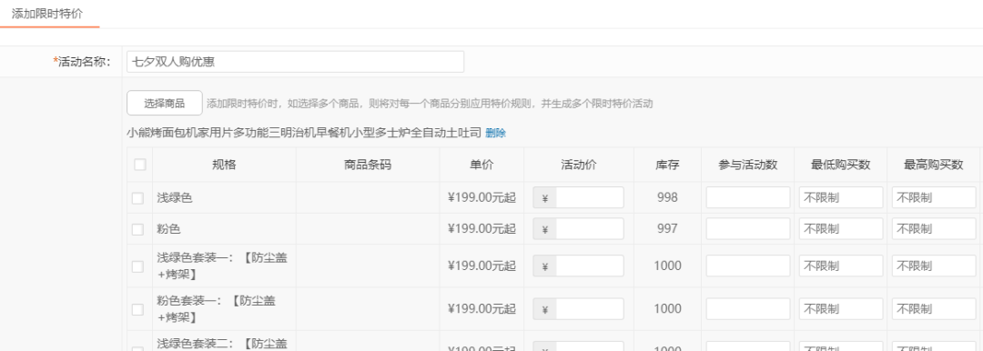 添加限時(shí)特jia時(shí),可一次性選擇多個(gè)商品;簡化zui低、zui高購買數(shù)量限zhi;去掉上傳限時(shí)特jia商品列表圖片要求;限時(shí)特jia商品列表的活動名稱改為顯示商品名稱